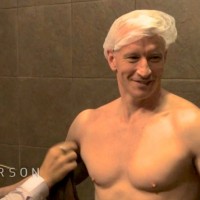 Fresh off from my serious moment with Anderson Cooper, I thought it would be a good time to get a little silly with the Silver Fox, and bring back these photos of a shirtless Mr. Cooper getting a (badly-needed) spray tan. It’s always good to see that those tight t-shirts he sometimes favors for location shots aren’t lying about what’s beneath them. Dude is built.