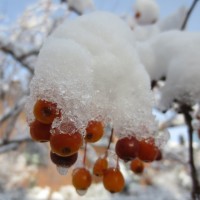 They aren’t the biggest fruit in the Winter bowl, but they carried just enough color to catch my eye, especially when highlighted by the white of the snow and set against the pale blue of the sky. If my memory of spring blossoms is true, these are cherries. Not the kind you eat (and even the birds seem to have left these largely alone), but the ornamental sort grown for their blooms and foliage.