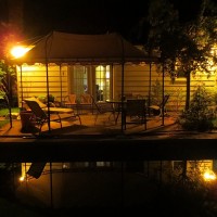 A spring night, hurtling all-too-quickly toward the start of summer. The leaves have just begun to fill in the barren branches of winter, the pots newly planted and looking a little sparse. It is always that way in the beginning. The artificial light casts an eerie glow to the surroundings, warmer than the moon, but also more sickly. It is the pallor of another world, the shading of a different brush. Tell-tale signs of the day remain: the patio furniture slightly askew, the overturned wheelbarrow, the hose running through the yard like an endless snake.