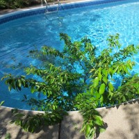 By the time I worked up the courage to venture out on a literal limb and begin pruning the cherry tree that had gone unattended for about three years too long, I neglected to factor in where the pruned branches might fall. My initial concern was the plants below, but once I got up there I was too scared to really worry about anything other than a power line and my own precarious balance. So this is one of the end results: a little tree in our pool. Along with a single felled peony branch, and a number of scratches on my arm, I think we all turned out rather well, especially when one considers the alternative: decimated peony plants, broken bones, and torn pool liners.