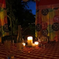 The door to the backyard terrace was open. Silk curtains fluttered in the breeze. A boozy group of friends laughed loudly in a dim corner lit only by candles and shrouded by a trio of potted palms.