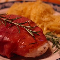 The recommended pasta was a tagliatelle, but a fettuccine made an adequate substitute – the key to the whole endeavor was the fresh sage. A little bit, chopped up as seen here, goes a long way, so use sparingly. You can also, as recommended in the original recipe, fry up a few whole sage leaves in some olive oil. They go quickly, so watch closely because it only takes a few seconds once the oil gets hot. Dry them on a paper towel then use them to garnish the top of the pasta, along with some freshly grated Parmesan cheese.