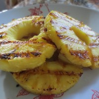 Pineapple. Grilled pineapple. A few years ago it would have been unthinkable, but having finally come around to the beauty and deliciousness of properly grilled foods, I’m a convert, and a grilling fiend. If it can be eaten, it can be grilled. (We’ve even done an excellent grilled cabbage – a whole head cut into wedges and coated in butter, salt and pepper – that fell apart in the mouth and tantalized in a way that no other method of preparation could have produced.)