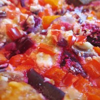Andy is a magician in the kitchen, as evidenced by this recent beet and goat cheese pizza. A somewhat unorthodox pizza combination, it was supplemented by peppers and red onions, resulting in the riot of warm colors you see here. Food is about more than taste – it’s about texture and temperature and, yes, presentation. While pretty dishes don’t necessarily translate to yummy eats, when the two combine it makes for a merry moment, and a merry meal.