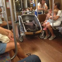 Every time I say anything remotely critical of parents and children, some Mom or Dad gets all riled up and defensive, as if I’m attacking their own kid. This time, I’m going to reserve my personal feelings on the matter at hand and simply leave this out for interpretation and private discussion: this double-wide stroller was parked in the middle of a T car the last time I was in Boston. As you can see, it was impossible for anyone wider than 18 inches to pass by it. I genuinely want to know if this is acceptable to others. (I’m not proffering an opinion one way or another, so there’s no need to go crazy on my ass.) What is the best way to travel with such a stroller on public transportation (it didn’t look like it could be folded into a more manageable size)?