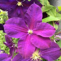 This classic clematis was planted soon after we moved into our home, which makes it a decade and a half old. It’s trained, rather loosely, to climb the lamp-post in the front yard, but I’m afraid I tend to let it flop and run rather than tying it up so it climbs higher. Still, it performs, even when it gets mown down (as it did a few times before a spreading sedum was put at its base to shade the roots and offer a buffer to the wrath of Andy’s mower). This year it’s especially floriferous, so I may coddle it a bit for next year’s show. Preparation for a comeback always starts early.
