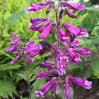 Less troublesome, and the reason why I haven’t excised it to the hidden side yard yet, is the coloring. It’s a gorgeous hue somewhere between fuchsia and purple, and it gets set off brilliantly by a backing of lady ferns currently in their early-season chartreuse shading. That combination alone sets off fireworks, and saved this little penstemon for the moment.