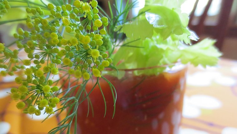 The blossom part was a bit dicey – in such heat it wilted almost instantly, but the flavor and tart and tangy bite of the dill lent a delicious new slant to the proceedings, and would tie it in nicely to a fresh herb omelette. Here are some of the possibilities for making a Bloody Mary into an event.