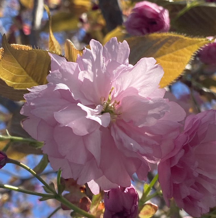 A super sunny weekend was just what our Kwanzan cherry tree needed to begin its annual show. These happy blooms coincided with the turn of the season – emotionally and weather-wise – even if we are due for rain in a few more days. The roller-coaster of spring rushes onward – up and down and round and round. The buds snuck up on me this year. Our downtrodden state of affairs had given me no reason to raise my head skyward, and on rainy days when I ventured outside, I was mostly hunched over, seeking signs of life on the ground, not in the air.