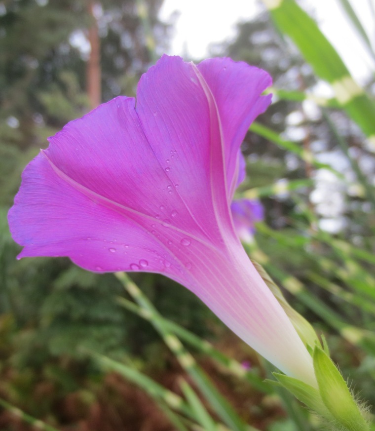 Behold the morning glory. Aptly-named for its blooming schedule, they are gone by early afternoon – sometimes sooner if the day is hot and the sun is bright. Made up of one round petal, they are delicate blooms, but the plant is hardy as hell, re-seeding itself like a male whore.