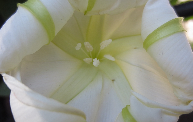 The same holds true for the fading moonflower seen below – at least I think it’s a moonflower. I passed it at the height of the day and couldn’t be sure. I like how it’s just slightly past its prime, curling in on itself and leaving the world with the barely-glimpsed artfully-recoiled curvature of petals in decline.