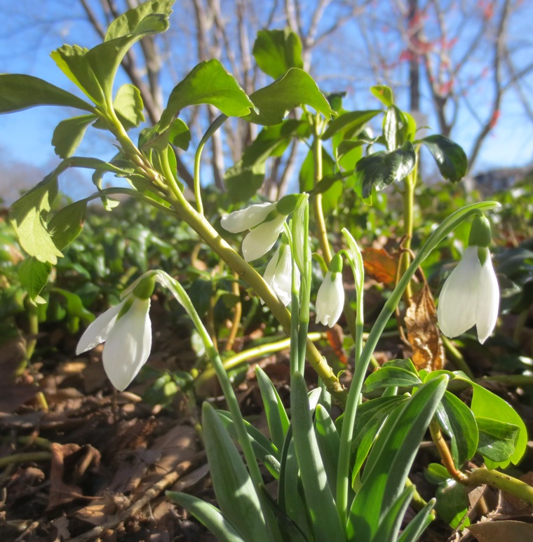 These early spring bulbs rarely show themselves before March, but this small clump was in resplendent late-afternoon bloom at the tail-end of February. They lived up to their common name of ‘Snowdrops’ as patches of dirty white stuff still clung to shaded spots, and the only other signs of life were a few branches of witch hazel suspended overhead.