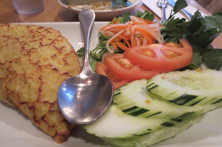 This sort of pancake can’t be baked with Bisquick. It’s a Vietnamese pancake (Bánh Xèo’) and I had it at Phở Basil in Boston recently.