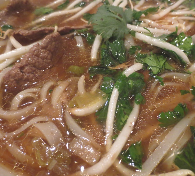 I simply tear the basil apart with my hands and drop it into the broth, along with a handful of sprouts. A few squeezes of lime is enough to spruce up the surface, then I stir in some hoisin and Sriracha. For my home-grown version, I tore up the additional cilantro since I love it so much. The end result was decent enough – and an almost-authentic approximation of the pho I’d only had at restaurants.