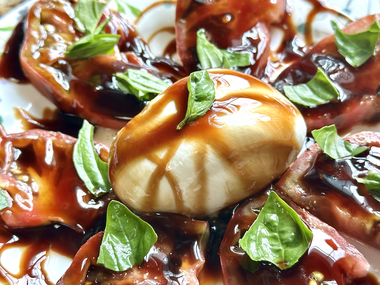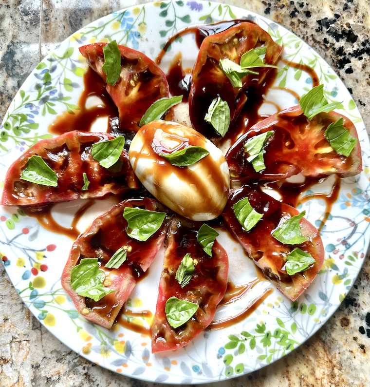 Andy and I discovered the magic of burrata several years ago, and since then one of my favorite dishes that he prepares is this simple tomato, burrata and fresh basil combo. Drizzled with balsamic vinegar and olive oil, and sprinkled with some sea salt and freshly-ground pepper, it is a magical summer lunch or dinner – it manages to be both light and substantial (especially when accompanied by some good crusty bread). Andy is always good at recreating the best dishes.