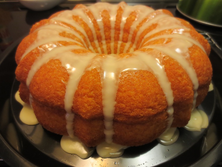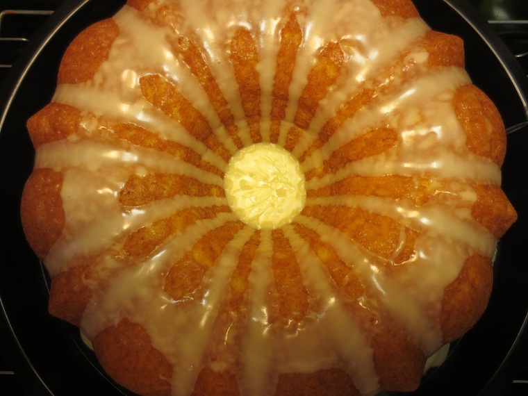 Pour evenly into prepared Bundt pan and tap gently on the counter to release any air bubbles. Bake for 45 to 50 minutes. A toothpick inserted in the center should come out clean. (Do not overbake or it will become dry.) Let rest for 5 minutes. Gently loosen edges around the rims with a thin rubber spatula. Invert and unmold from Bundt pan onto a cake platter, then glaze while warm.