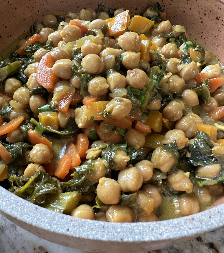 Once the garbanzos were warmed, I modified the salt and pepper (lots of both) and piled the pot high with kale and spinach. A whole bag will wilt down into the manageable mix you see here.