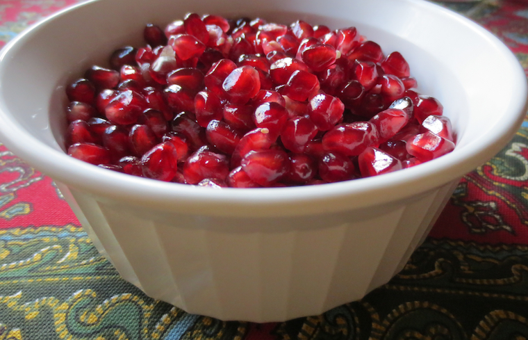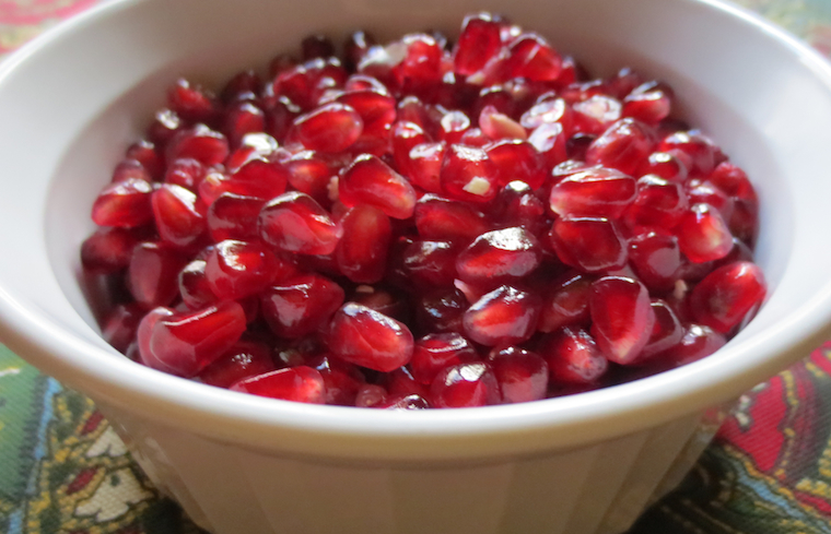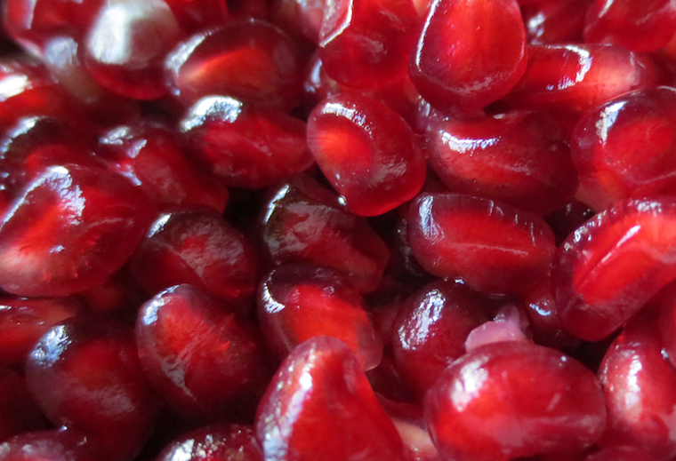 These precious gems are pomegranates, and once removed from their encasement they shine like jewels. The trick to excavating them and not getting your hands stained with their potent color, is to cut the whole fruit in half, then work to remove the seeds in a bowl of water. It just takes a bit of practice, and soon you’ll have a gorgeous pile of antioxidant-rich fruit, ready for snacking, cocktailing, or just sprinkling on melon or salads.