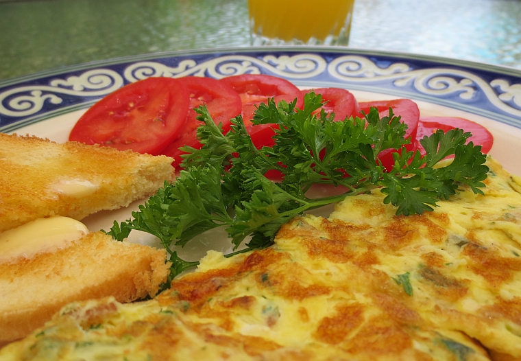 This is the first year where I’ve consciously planted a number of herbs for our culinary preparations, and it has certainly paid off. A collection of dill, flat-leaf parsley, and basil comprises the addendum to this omelette. (A garnish of curly parsley centers the dish.)