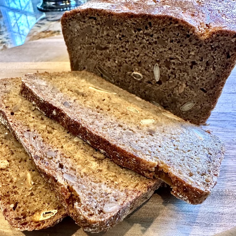 In service of our homage to ‘Babette’s Feast’ – happily updated as ‘Suzette’s Feast‘ for our silly intents and purposes – I tried my hand at this simplified version of Danish rye bread (Rugbrød) – thank you Kristi – love the floral head wreath! Given my penchant for the occasional kitchen mishap, and Mercury being in retrograde, I was wise enough to do a test batch before baking the actual version I’ll be serving at dinner tomorrow. That proved fortuitous, as I made a fatal error in one of the ingredients.