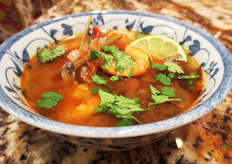 A fabulous Duchess recently asked me for a soup recipe, and while I didn’t have the exact one she wanted, I’m putting up this version of Tom Yum soup I found online and tested out a few days ago. While my traditional go-to meal for staving off the cold of winter is pho, this one is a worthy winter-beater as well, with the heat from all the chili peppers giving some red-hot goodness to the spicy broth. (If you’re having trouble finding some of the more exotic ingredients and you don’t have access to a decent Asian market, try going online. I’ve found some wonderful suppliers of Kaffir lime leaves just a few clicks away, and once you get a batch they freeze quite well for a while.)