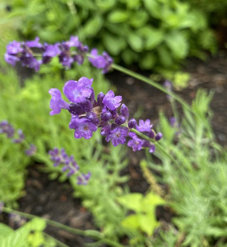 My summer dreams of lining our pool border with lavender and herbs went out the window while waiting for the new liner to be installed. (Update: the wait continues. But the steps are roughly done!) We may be putting a light in, so the garden will be dug up and destroyed, which is why I didn’t bother with putting any lavender in yet. We have a couple of plants that have survived over the years, and they are in bloom now. All one needs for a proper garnish is a single flower stalk. Thank goodness, because that’s about all that we have.