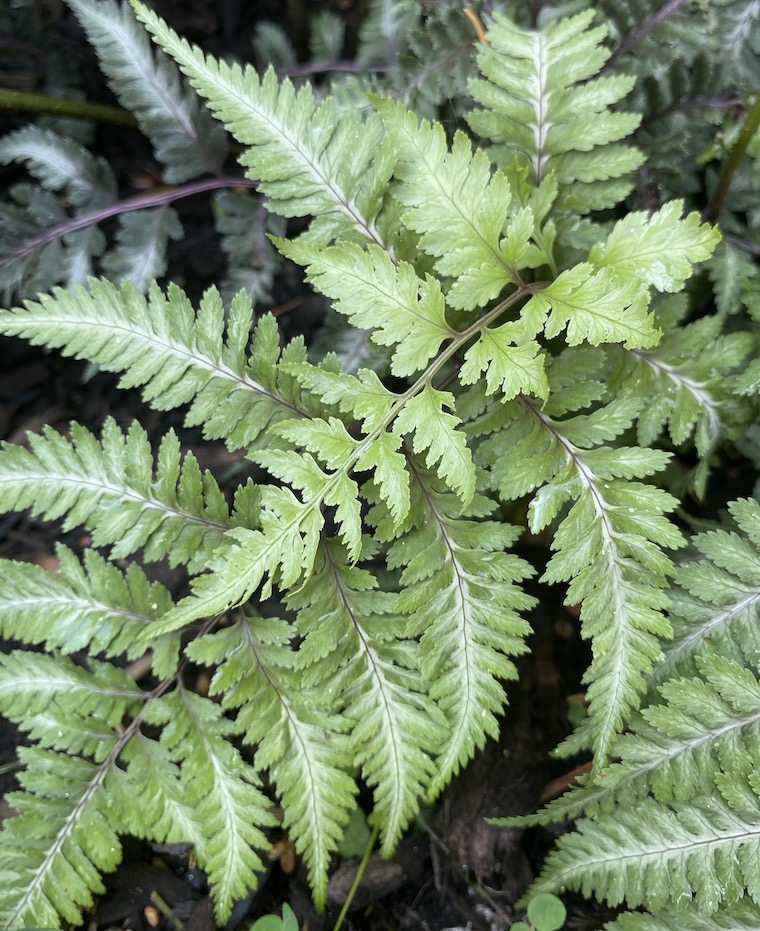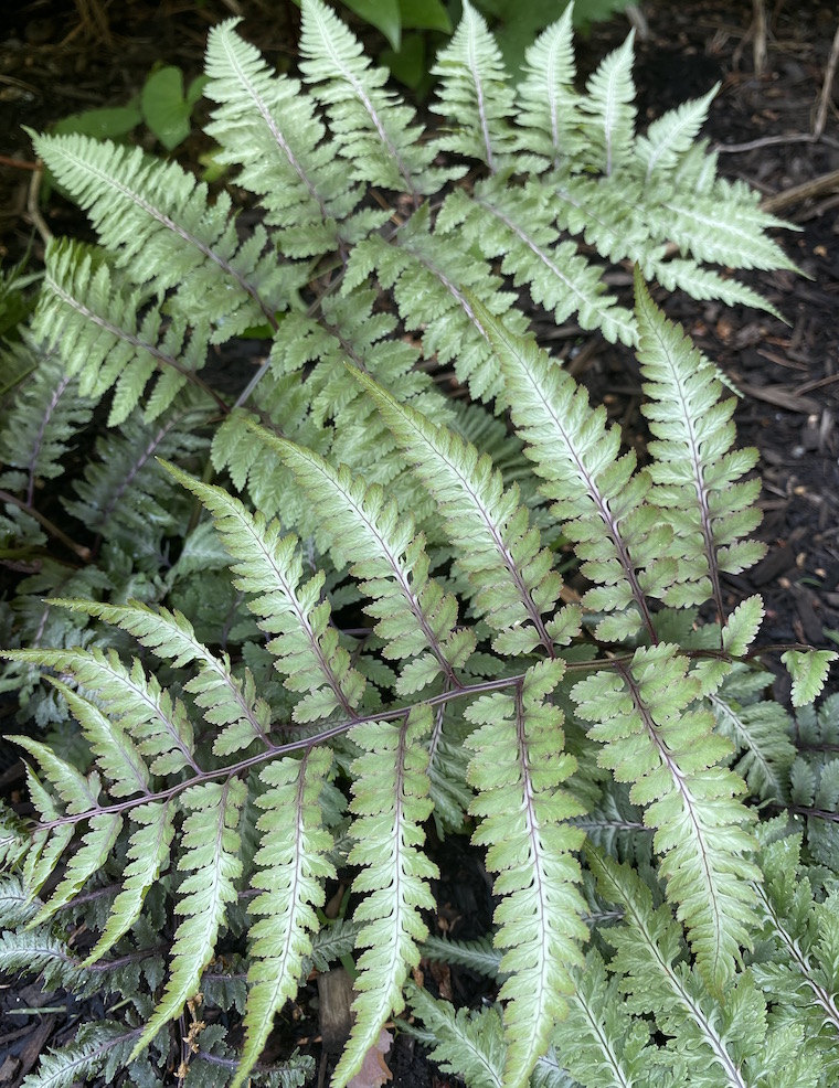One of the most exquisite plants in the garden right now – and throughout the entire season for that matter – is the Japanese painted fern (Athyrium niponicum). Do not be tricked by its delicate painted and they are also said to be deer resistant. I planted one a few years ago, and it has since become a dozen, partly from creeping on its own, but mostly (and rather impressively) sporing itself out into the damper areas of the garden.