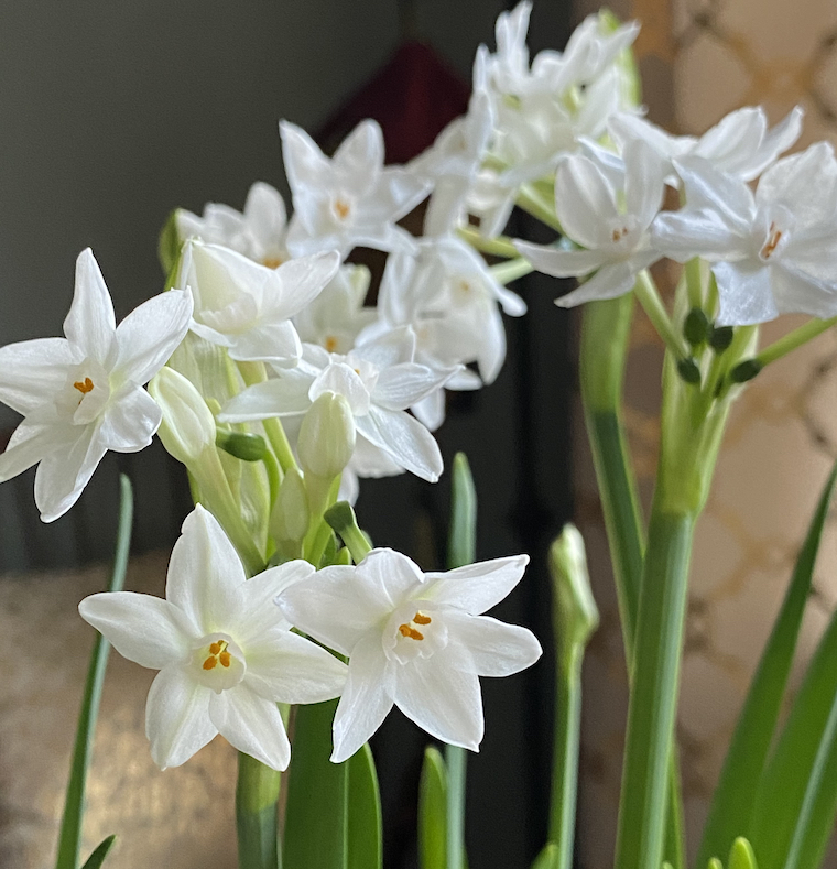 Luckily, in this instance it wasn’t too late. They called to me in the garage, with bits of green and the smallest swords of cream emerging from the top of their papery brown bulbs. Maybe it was the emerging leaves of an early fig tree that reminded me of forgotten things. Whatever the case, I found the bag of paperwhite narcissus bulbs just in time, then planted them in some gravel, watered them well, and then they instantly grew, quicker and faster than their predecessors did back in the fall. They weren’t quite as high, but they smelled just as distinctly, their perfume a potent reminder of the past, their blooms gathered in bunches of sterling stars. It wasn’t too late after all ~ a lovely reminder for those of us lacking in patience and too ready for rash motions.