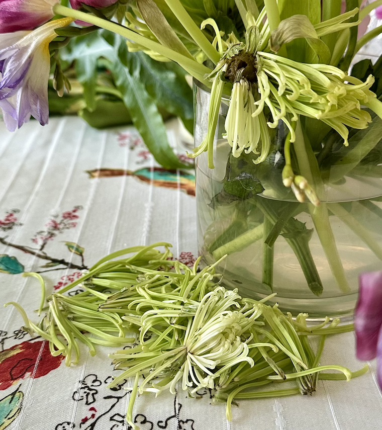 I’ve pushed against that, finding beauty and interest in the bouquet that is past its prime, or falling apart entirely. I like seeing the way some flowers dry in place, or lose their petals, or wilt and decay into gorgeously grotesque form.