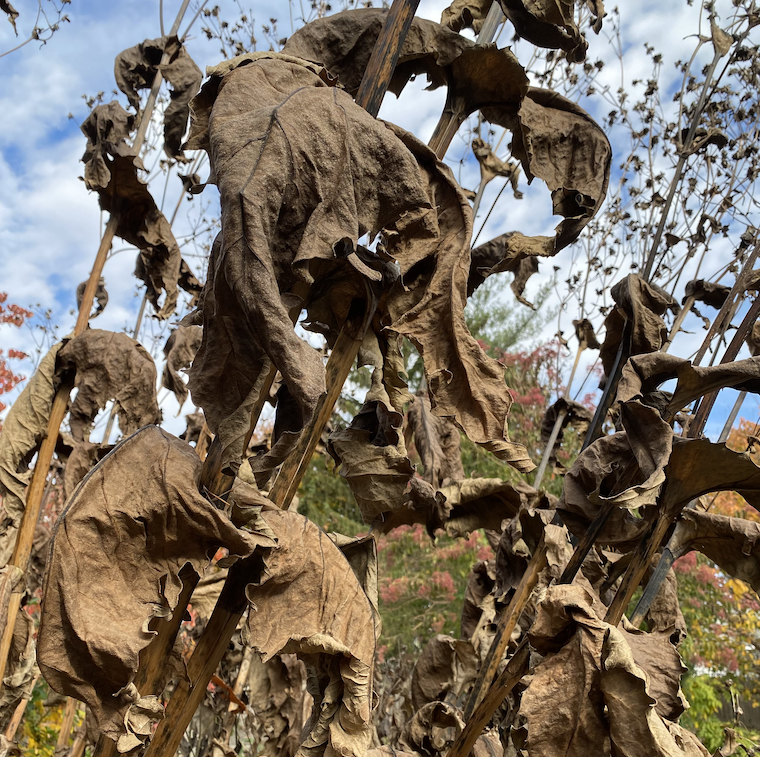 These stalks will stand strong throughout the winter, bravely defying wind and rain and sleet and snow. The leaves will gradually be torn from them, slowly disintegrating by the time the last days of winter limp away, until it’s just the spindly spires splintering apart as spring makes her grand return.