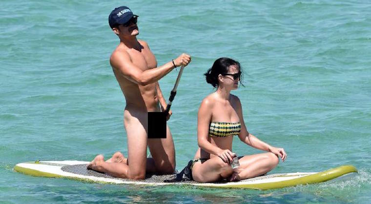 In what can only be a publicity move of bold proportions, Orlando Bloom just went paddle-boarding with Katy Perry… and without a stitch of clothing (save a hat, since he seems to be concerned with covering at least one head). A full-frontal shot of Orlando Bloom won’t find its uncensored way to this blog – sorry, folks – but here’s what we can show you, and it’s NSFW enough. Mr. Bloom has already busted out his naked butt in these parts, and to much acclaim, so he looks to recapture some of that nude glory today.
