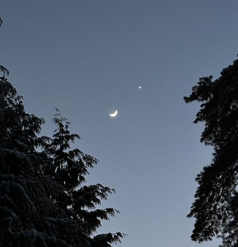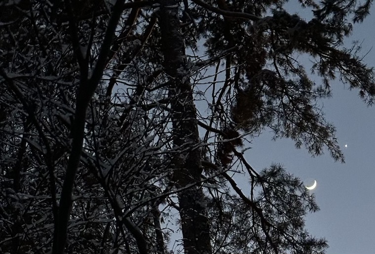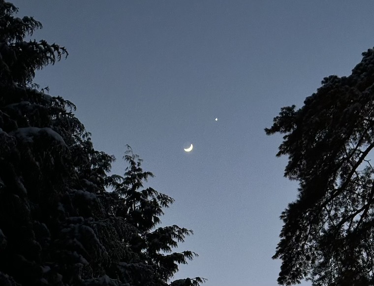 Love and lunacy on full display in the winter sky – this is Venus making motions to kiss the moon on an early February evening. Winter has always held its enchanting delights if you know where and when to look for them. I’m not so well-informed, so this was a happy catch that I didn’t realize I made until after the fact. The Cowboy Junkies wrote a song about this scene for their album ‘Pale Sun, Crescent Moon’.