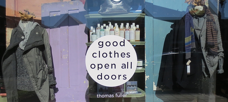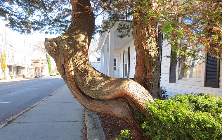 The second photo is of a sign and sentiment that I hold near and dear to my heart. I’m not saying that it’s right or fair or the way the world should be, but it is largely true. Appearance does matter, and sometimes the clothes do make the man. The third photo, below, was just something that struck me as slightly suggestive. It’s a gnarled juniper hanging over the sidewalk along Main Street. Something about its curves and crevices lends it an erotic aspect.