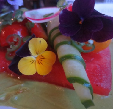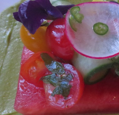 As another sun set over the Sound, and the gorgeousness of impending twilight lowered itself as a backdrop, one of the most enchanting salads I’ve ever seen appeared on the table. A bed of smooth avocado, topped by a slab of exquisitely-ripe watermelon, formed the base of this whimsical treat, accented by edible violets and cucumber horns. Forget salad – this was a veritable art installation.