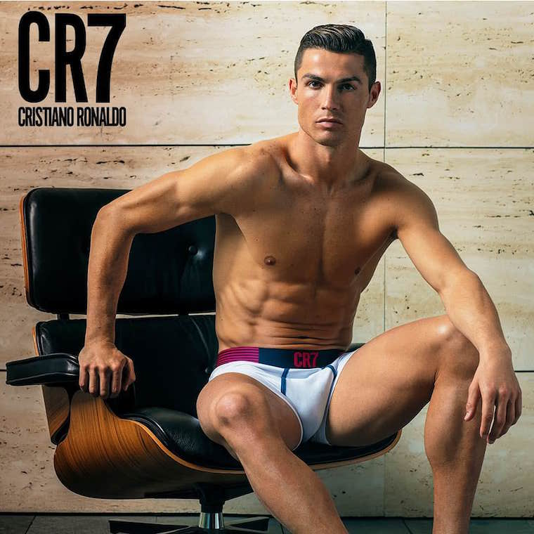 We interrupt our usual black-out day in honor of that amazing goal by this gentleman. A few too many hot minutes have passed since we last saw Cristiano Ronaldo in his underwear, and since he’s still selling his own line of skivvies (CR7), now is as good a time as any to revisit what he’s packing and packaging for the interested consumer. He’s been featured prominently here before, as in this post displaying his tighty-whities, or this one where he made his debut as Hunk of the Day. If you search hard enough, you’ll even find him in this linky-link