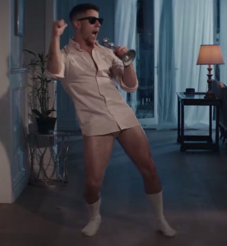 In their latest video for ‘What A Man Gotta Do’ the Jonas Brothers neatly pay homage to several classic movies, most notably ‘Risky Business’, which gives Nick Jonas an excuse to parade around in his tighty-whities and dress shirt – and inspiring both Joe and Kevin to give a quick glimpse of their briefs too. The gay-baiting is strong and welcome in this group. [See also Nick Jonas in underwear, Joe Jonas in underwear, and Kevin Jonas in bright colors.]