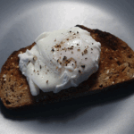 The runny golden yolk of an egg oozing into the middle of an egg, cheese and tomato ...