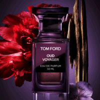 ‘Oud Voyager moves the perception of oud into the hyper-saturated floralcy of jewel-like reds and purples found in geranium and peony. Geranium absolute, with its rosy, fruity vitality, brings an element of freshness. Cardamom and saffron oils lend an enveloping warmth. Citrus freshness intertwines with the bold vibrancy of pink pepper notes for a dazzling embarkment on an olfactive journey. From the shadows, a red peony accord emerges.’ – Tom Ford