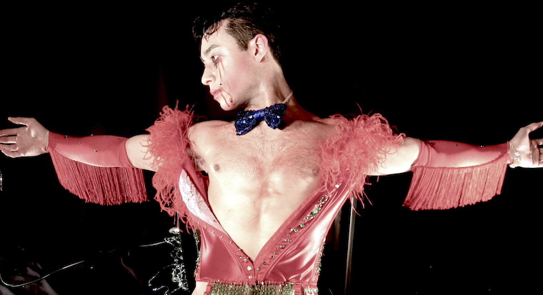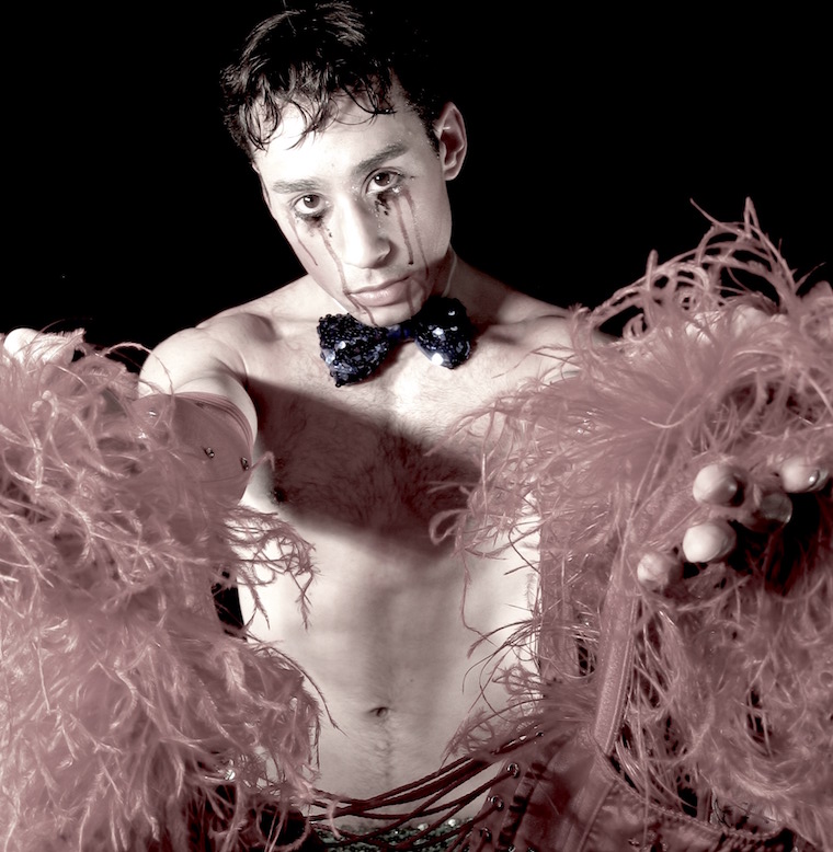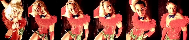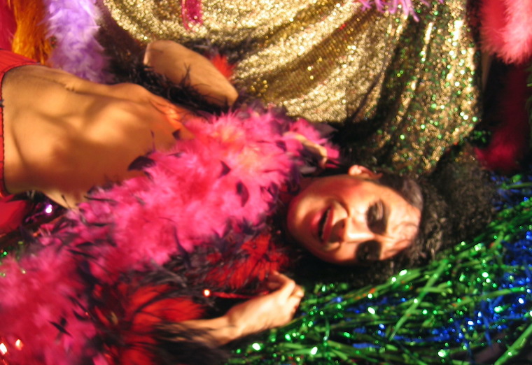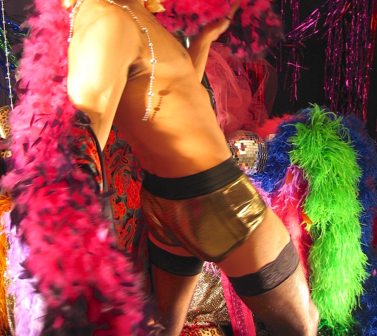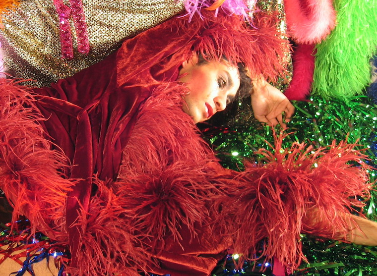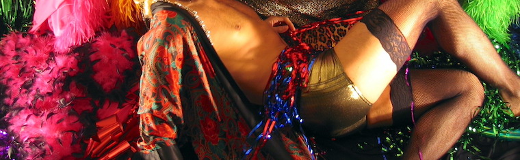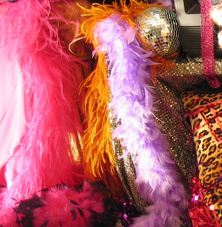 Bands of black lace cut the thigh, a fishnet harlequin shades the legs, and a bed of feather boas gives false comfort and deceitful glamour. How can they see with sequins in their eyes?