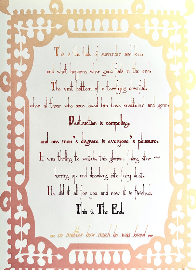 And yet I’ve shown you much, allowed you to live vicariously through these odd scenarios I’ve concocted, these strange flights of delusional grandeur. Give the entertainment its proper due. Applause here as I bow down, Mister. You have me to thank for passing your hours with such charm and wit and humor – I ask for nothing else. It was done for the thrill of it all. For the vanity. For the escape. For the Diva that I am and I’ll be always. And for you – all you wonderful people out there… in the dark… I have done al of this thinking it’s what you wanted from me, what you expected, what you anticipated and desired – and you couldn’t even care less. You say you love me, you tell me I’m handsome, talented, beautiful and lucky – and still you couldn’t care. Now here I am – left alone, left to be looked at – a pool of tears, a messy ruin, a genius in the throes of self-destructive abandon – and you just cannot care. So fuck you, fuck all of you, and fuck me too. Fuck me for caring so Goddamn much, fuck me for trying to be Someone, and fuck me for half-succeeding. You can’t forgive such foolishness, and neither can I. We are too selfish to enjoy someone’s else’s happiness for long. Let this misery be my gift to you. Farewell wicked world.