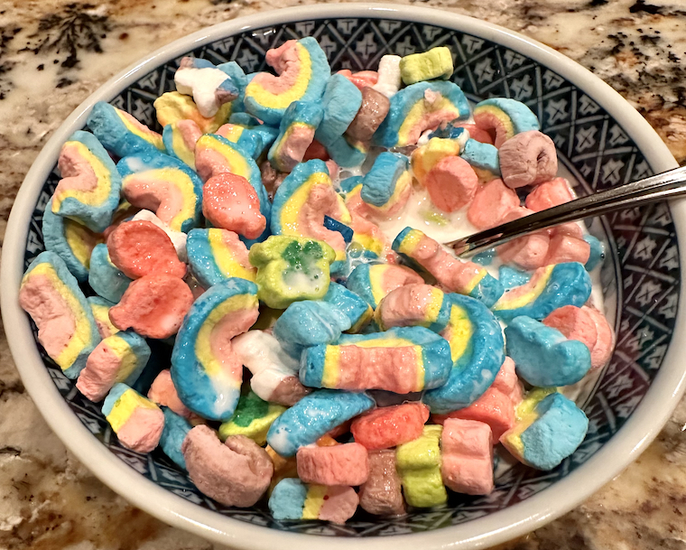 My friend Betsy gave me a box of Lucky Charms – Marshmallows only! – as part of my birthday gifts this year and it turned out to be one of the more pleasant surprises of the season. I haven’t had Lucky Charms in years – they were a mainstay of my early breakfasts at Brandeis, when I mustered up the strength and energy to make the trek to Sherman Dining Hall. (In later years I would simply grab a bite at Usdan Center instead of walking across campus for hot food.) Every once in a while I’ll pick up a box for nostalgia’s sake.