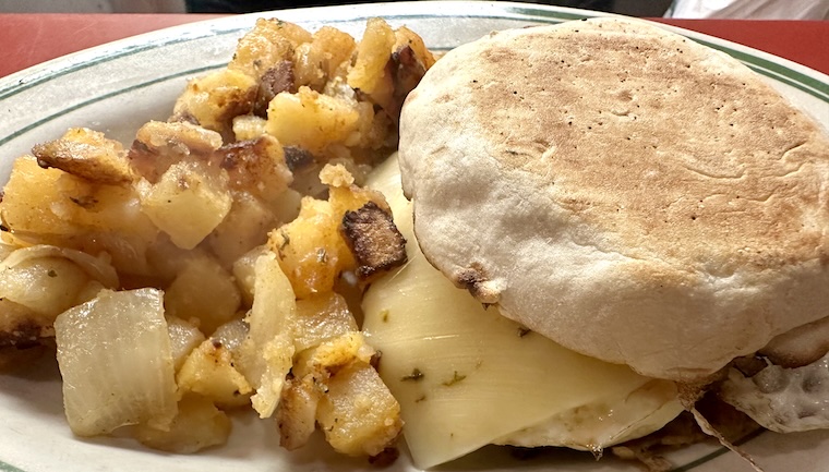 On the early Sunday morning of departure, I made my way to the diner nearby, Charlie’s, which has been in existence long before we moved in thirty years ago, and continues to provide comforting diner food for all early hunger pangs. On this morning, I opted for the Charlie’s Breakfast sandwich, and added some hot sauce for zing.