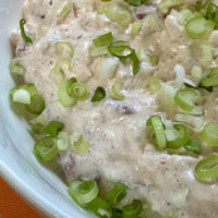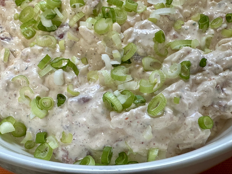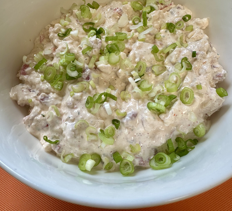 The weekly recap that usually populates this space on Monday morning will arrive later today, after I’ve returned from Boston. For now, a summer food offering to see us out of the month of June. There’s nothing very boat-like about this dip, and nothing truly island about our living, but both live and breathe in splendor this summer, despite our sea-free and landlocked state of reality. This dip recipe is simple and easy, and packs its flavorful punch thanks to two seasoning packages filled with what can only be awful things that taste good. I added a couple of chopped scallions for some color and freshness.