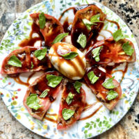Andy and I discovered the magic of burrata several years ago, and since then one of my favorite dishes that he prepares is this simple tomato, burrata and fresh basil combo. Drizzled with balsamic vinegar and olive oil, and sprinkled with some sea salt and freshly-ground pepper, it is a magical summer lunch or dinner – it manages to be both light and substantial (especially when accompanied by some good crusty bread). Andy is always good at recreating the best dishes.