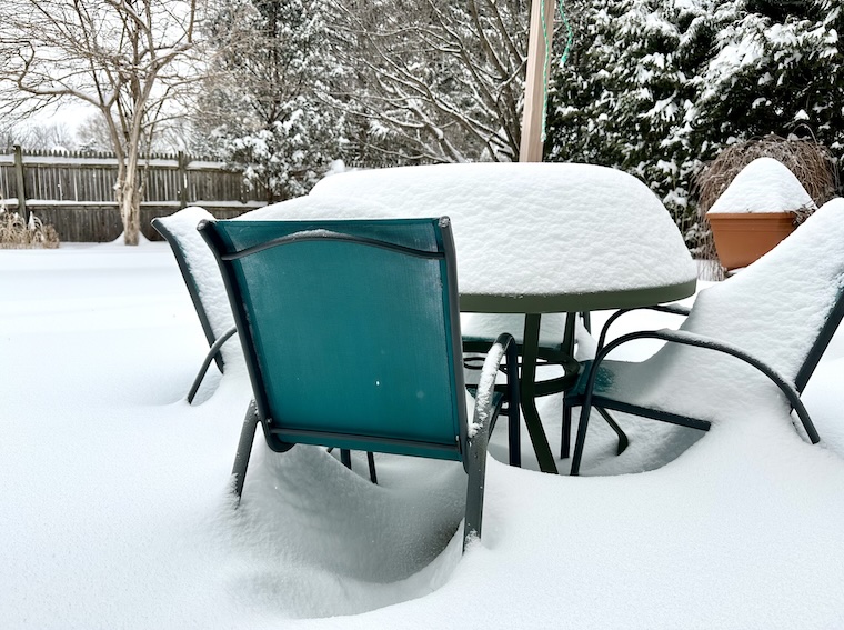 Here’s a look at our snowy patio furniture after fifteen inches of snow fell on us starting Sunday. It’s still falling out there as of this writing, so there may be a bit more by the time this gets posted.