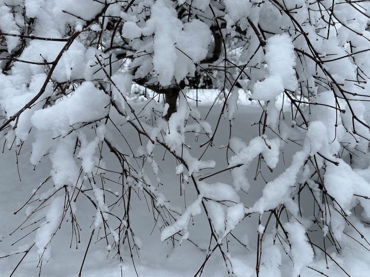 Three bluejays were triangulating their coordinates around a birdseed bell that Andy had hung in the backyard. We’d been expecting the squirrels to commandeer it like they did in a matter of hours when we last hung a seed bell there, but the excessive snow may be acting as a deterrent. Better than greasing the string I suppose. The blue jays make for a prettier scene anyway, their plumage matching the sky and bringing some badly-needed color to the surroundings.