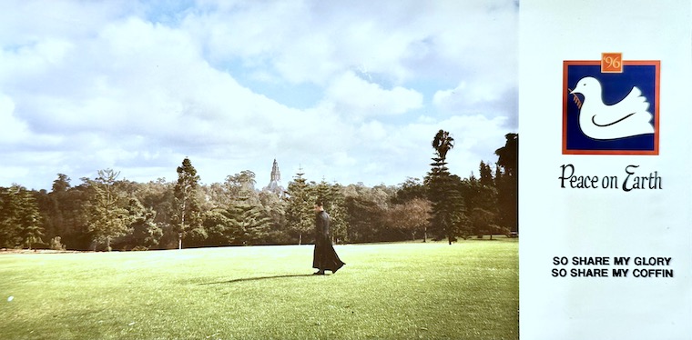 It made the intended splash and set the slightly-surprising tone for all the cards to follow – even garnering some element of controversy when a friend’s father misinterpreted the image as a scene of me killing myself via hanging (when suicide was so 1992). It seemed a little shocking at the time – feels nostalgic and quaint by today’s standards.