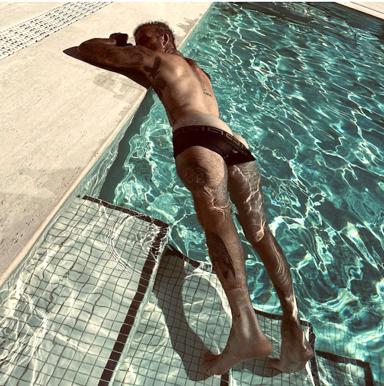 We have Victoria Beckham to thank for yet another moment of magnificence, as she posted this cheeky pic of her husband David Beckham showing a peek of his naked ass. Beckham’s booty has been celebrated wide and far, and in posts like this and this and this. He’s also been a favorite here as evidenced by this linky-licious post exhibiting his various attributes. This is the closest we’ve come to a true David Beckham nude posterior, so gratitude must be given to Victoria.