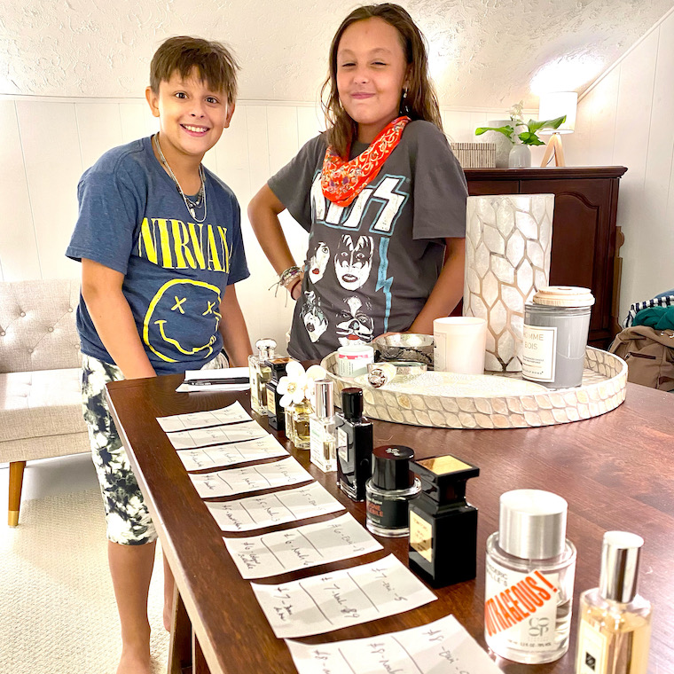 They’d been itching to go swimming at night with the pool light on since we re-did the pool last year, and the wait was worth it. I went in with them and played their games (they’re big on pretending that one of us was dead and needed rescuing, and who am I to psychoanalyze that kind of crazy-ass shit?) Once that was done, we went back up to the attic for an impromptu fragrance testing and rating. They each got to try a selection of scents while blindfolded at their insistence so they couldn’t tell which was which, and decide their favorite. Noah had the most expensive taste, selecting a Tom Ford as his favored cologne -‘Beau de Jour’ – while Emi went for the exquisitely floral ‘Mimosa & Cardamom’ by Jo Malone.) Then it was time for popcorn and the movie.