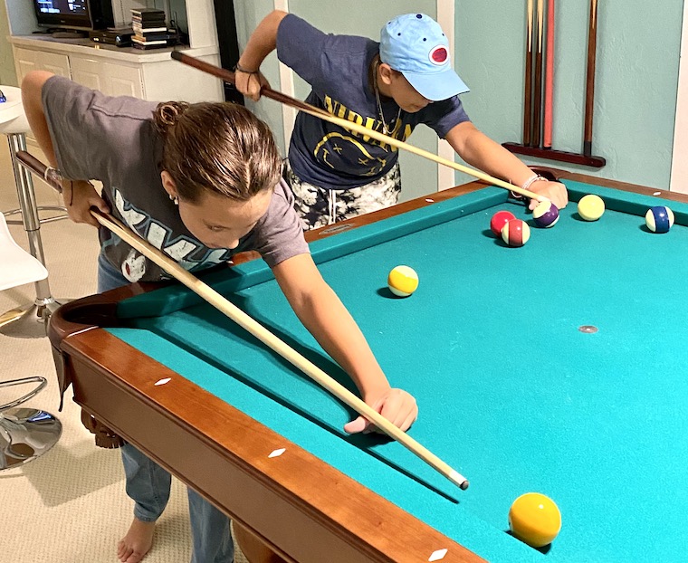 So it was that I invited them over to our home for some end-of-summer swimming and an overnight in the attic loft. They’d seen the room when it was first revamped and were excited to stay there on their own. Spending a late summer night there would hopefully imbue it with a happy memory from the beginning. Before that, however, there was pool – outside and inside. The former allowed some childhood energy and exertions to be spent before bedtime, and the latter afforded them the opportunity to hone their pool-playing skills in the basement.